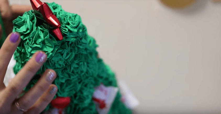 9. Третий ряд заполняется по такому же принципу. Вместо конфет можете использовать мелкие декоративные елочные игрушки. Но конфеты лучше — это вам любой ребенок подтвердит.