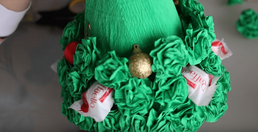 10. Аналогичным способом заполняем все последующие ряды — 2 розочки- 1 конфета. Верхушку украшаем маленькой елочной игрушкой.