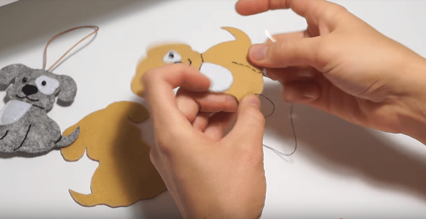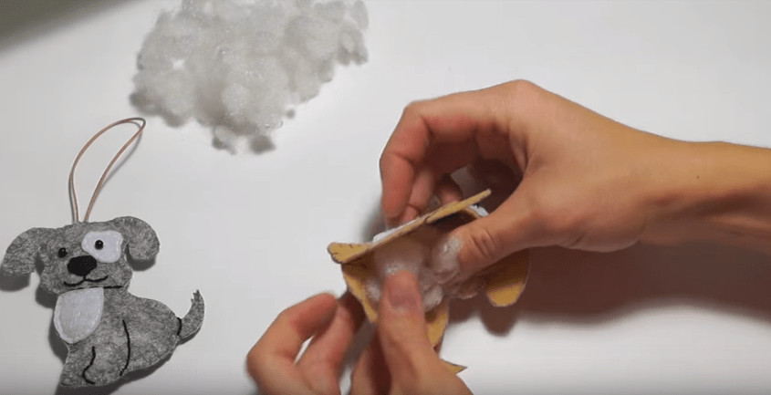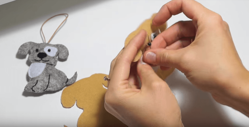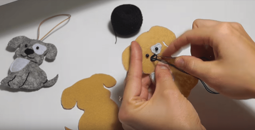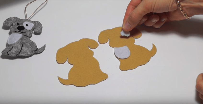 2. Из фетра другого цвета делаем для собачки пятнышко на груди и на мордочке. Эти элементы можно пришить или просто приклеить.