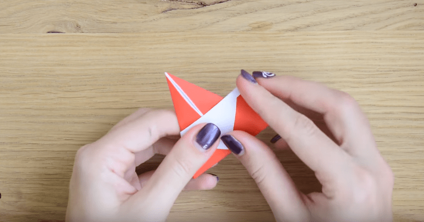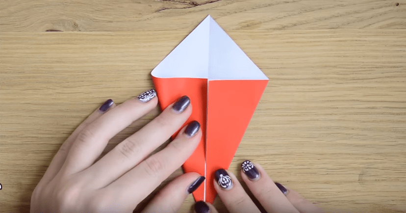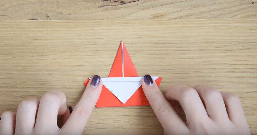 4. Переворачиваем заготовку обратной стороной и верхний угол загибаем к низу. Но не до конца, а не доходя несколько миллиметров. Это будет борода.