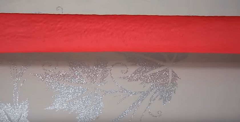 3. Дальше нужно сделать кучу розочек из гофрированной бумаги. Для этого отрезаем кусок бумаги длиной 20 см и шириной 5 см (в примере цвет красный, т.к. это розочка. Но для елки мы будем использовать зеленую бумагу)