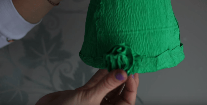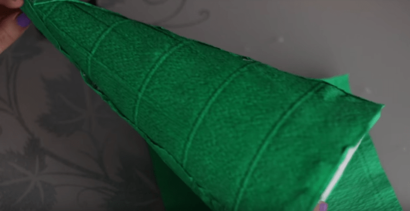 2. Вырезаем фигуру и склеиваем концы, чтобы получился конус. А затем обклеиваем его гофрированной бумагой.