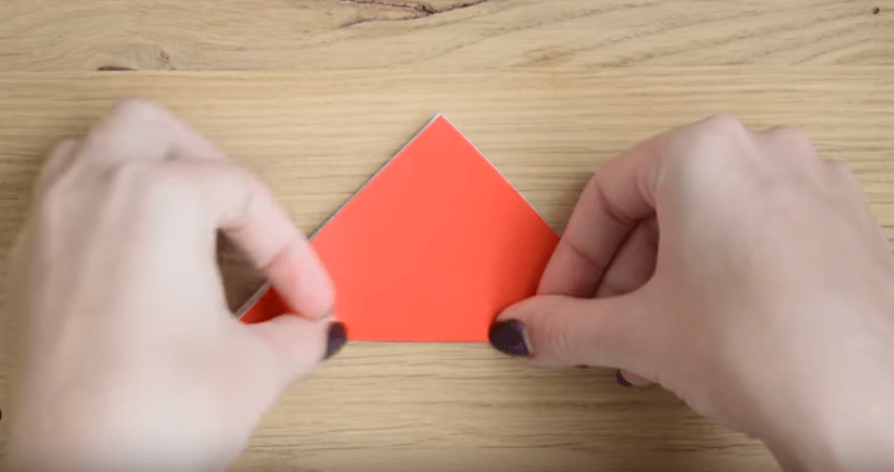 Лист сгибаем пополам по диагонали, чтобы получить линию, по которой будем ориентироваться при дальнейшей сборке.