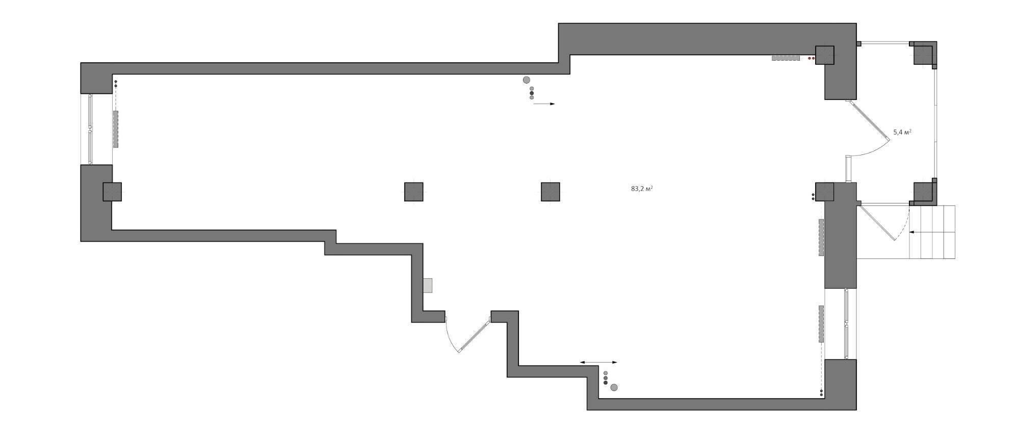 Исходный план квартиры без мебели и стен. Это квартира со свободной планировкой, несущие конструкции — стены по периметру и колонны. Изображение: студия TB.Design
