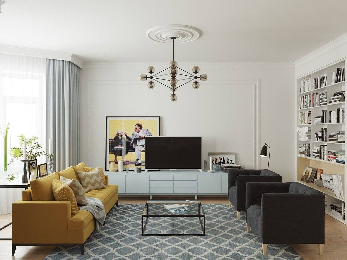 Основными предметами мебели в гостиной являются диван, телевизор, журнальный столик или удобный объемный пуфик.