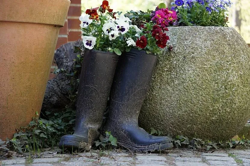 Применение обуви в качестве основания для клумб всегда считалось актуальным способом украшения дачи. Используйте те башмаки, которые уже вышли из моды, стали поношенными, у них оторвался каблук или подошва. Эти детали можно склеить, и они послужат отличным горшком для рассады декоративных растений.