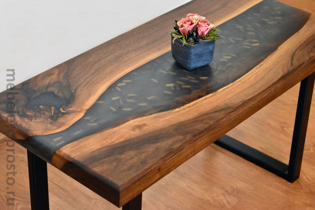 Если нужна ровная поверхность, трещины и сколы заливают прозрачной эпоксидной смолой, которая создает эффект, будто дерево находится внутри стекла.