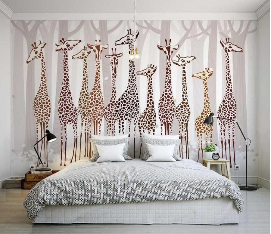 Животный мир на стенах выполняют в динамике. Движущиеся фигуры (львы, носороги, волки) часто «пробивают» перегородки и врываются в зал. Если нужна умиротворяющая домашняя атмосфера, то используют изображения кошек, детенышей и птенцов.