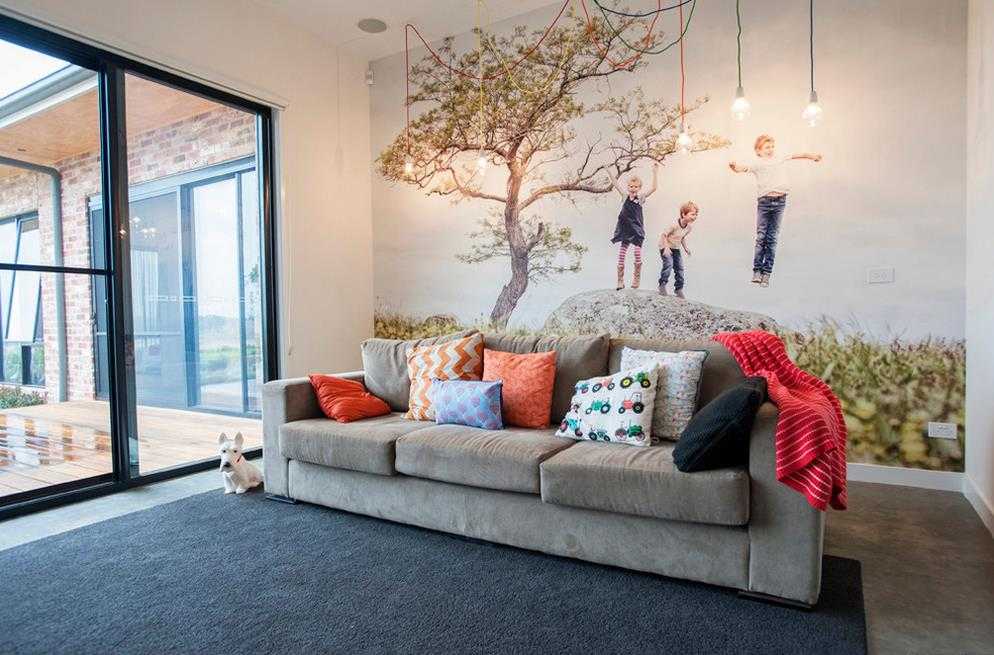 Стены гостиной можно оклеить фотообоями с персонами. Среди популярных мотивов дизайнеры отмечают изящные безликие силуэты и портреты известных личностей. На поверхности красиво смотрятся семейные снимки или отдельные изображения владельцев жилья.