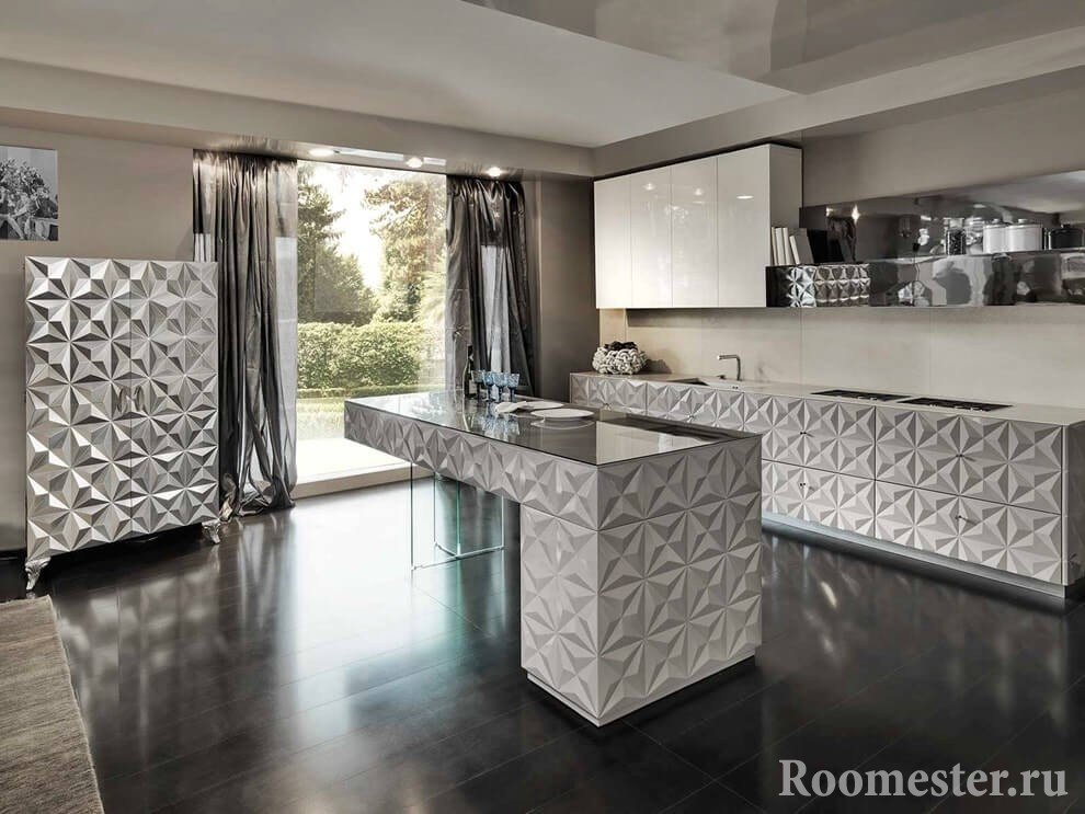 Второй по популярности вариант – использование 3д панели для стен в интерьере кухни или столовой. Здесь, как правило, предпочтение отдают пластиковым или МДФ панелям, поскольку они просты в уходе и устойчивы к влаге. Если речь идет о применении гипсовых материалов, то их дополнительно покрывают водоотталкивающими лаками.