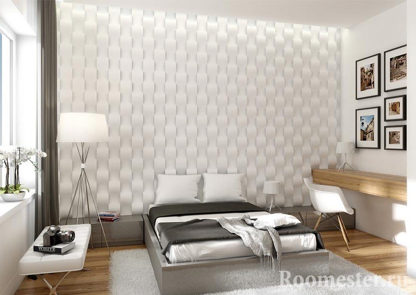 В спальне обычно не так много мест, где объемная фактура будет смотреться выгодно. В большинстве случаев это стена у изголовья кровати