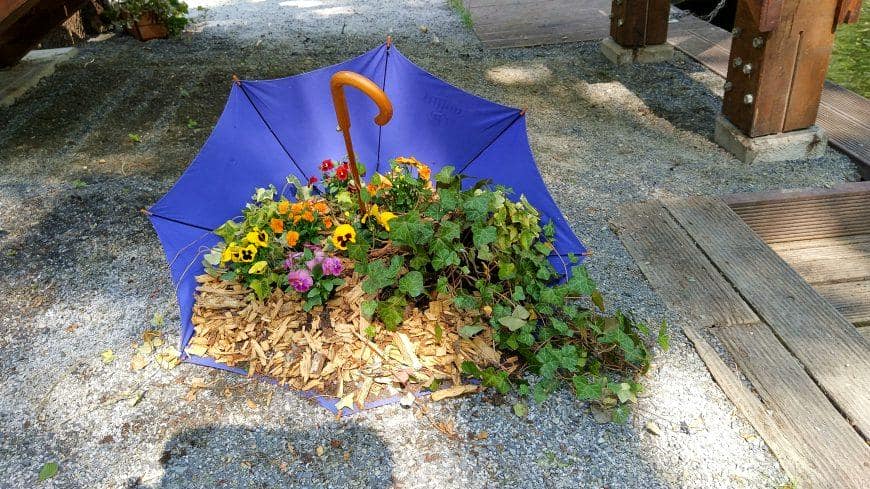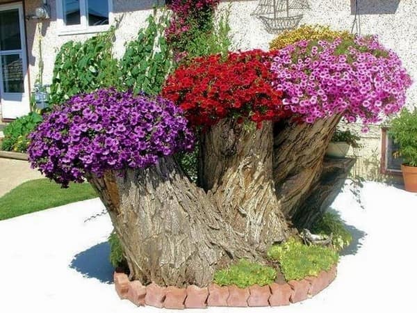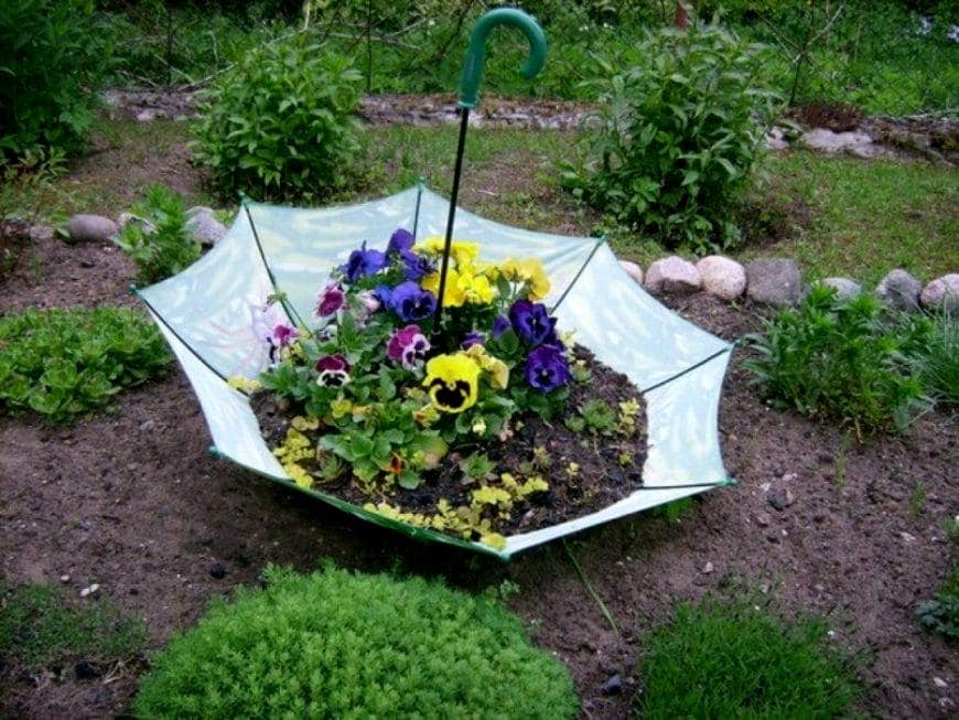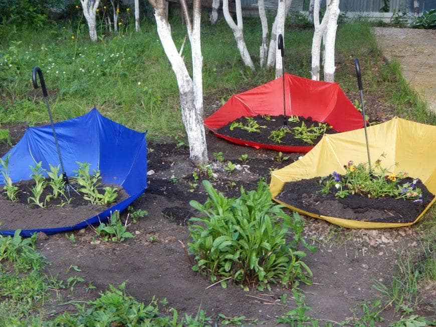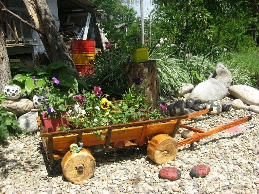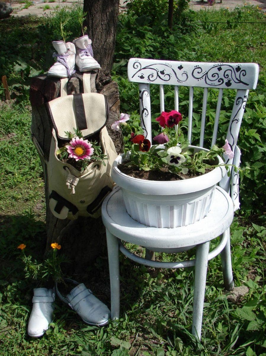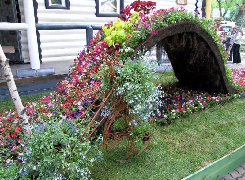Бочки, кадки можно разрисовывать в яркие тона, изображать на них матрёшек или сказочных существ, оклеивать ракушками, зёрнами кукурузы или фасоли. Сломанная мебель, расставленная вдоль стен с цветущими композициями, отжившая свой век лодка с благоухающими насаждениями, кровать, устеленная цветочками, все эти элементы преображают окружающую атмосферу, внося свежую нотку.