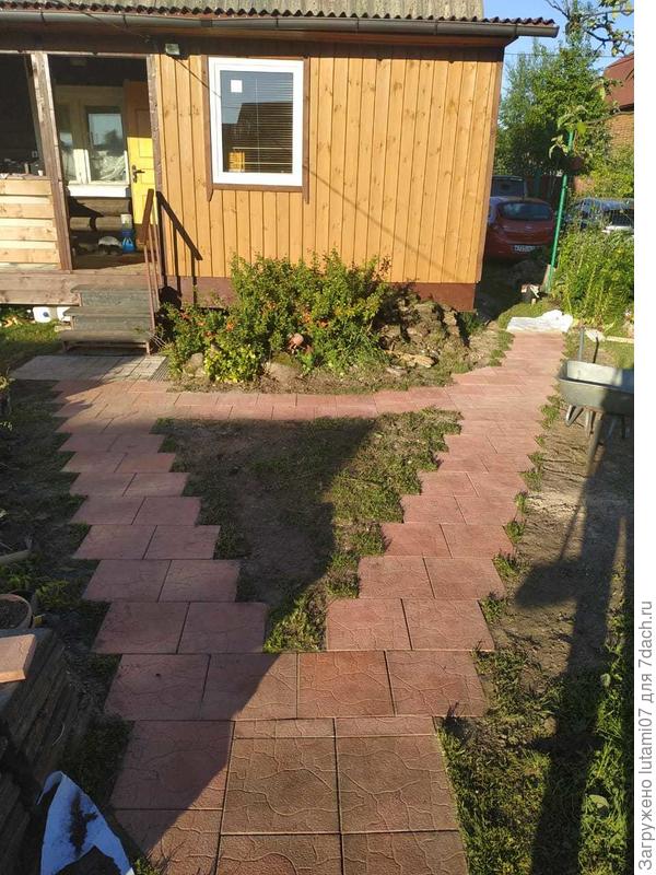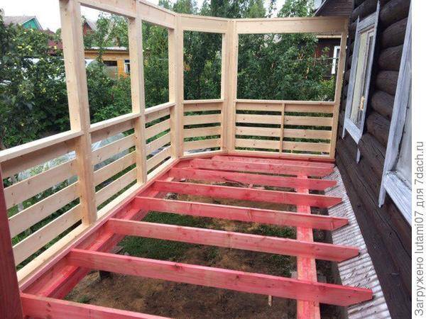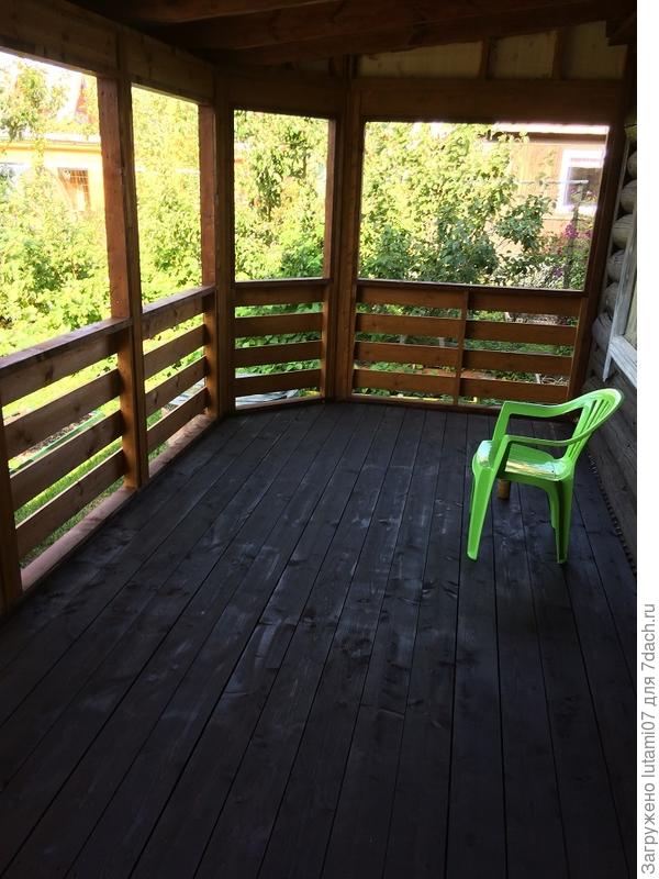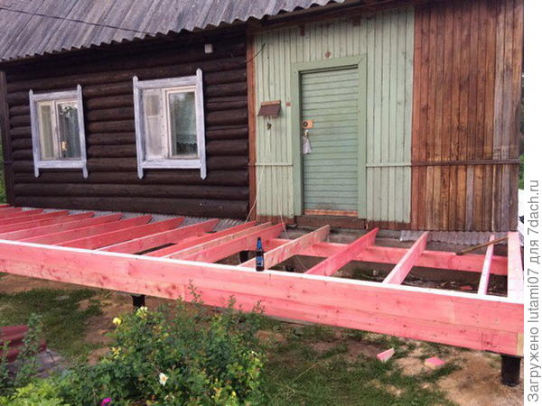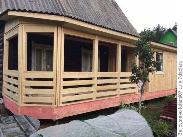 Первоначально крыльцо было сделано совсем небольшим. И на мой взгляд, неудобным. Потому что не видно, кто в дом заходит. Долго мы решали, как будем строить террасу. Наши мужчины хотели это делать сами. Конечно, я не сомневаюсь что они это сделали бы. Руки правильно растут. Но! Вся стройка растянулась бы на целое лето (если не на два), ведь возможность делать есть только по выходным. Да еще погода может подвести. Конечно, и по деньгам вышло бы дешевле.