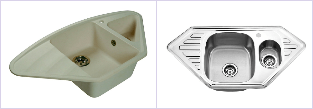 Она изготовлена в виде скошенной трапеции или треугольника, и такие типы моек лучше всего подойдут для помещений маленького размера (это касается кухонь в хрущевках). Угловые мойки для кухонь являются не самым удобным вариантом для мытья посуды, но зато здорово помогают экономить пространство.