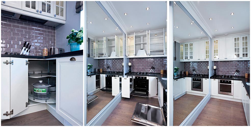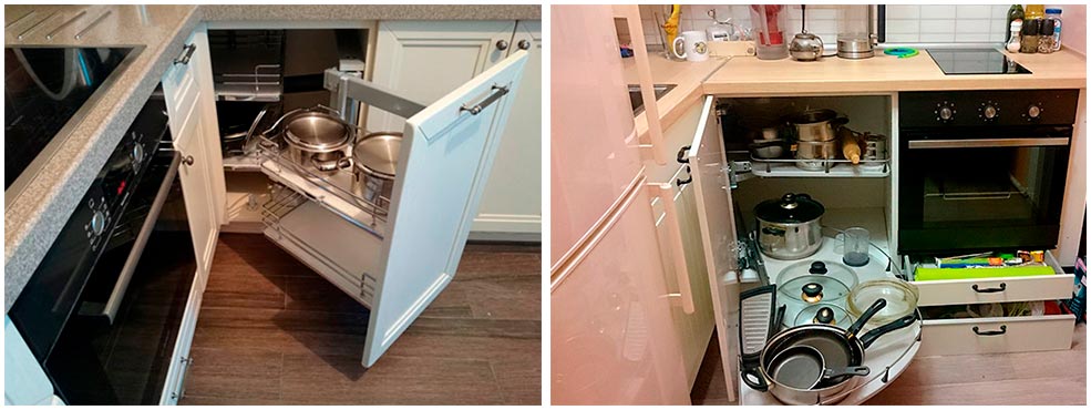 Сложности с использованием углов в помещении при отсутствии продуманности планировки отражаются и на ее функциональности. Такие углы становятся местом скопления мусора и пыли. Для их эффективного использования нужно применить наиболее соответствующие такому размещению модульные конструкции, как напольные, так и навесные. Для них стоит подобрать и удобную фурнитуру в виде карусельных элементов, выдвижных этажерок или корзин.