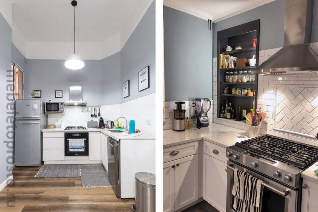 Много естественного света на кухне с двумя рабочими зонами вдоль противоположных стен, помогает создать функциональный и светлый интерьер