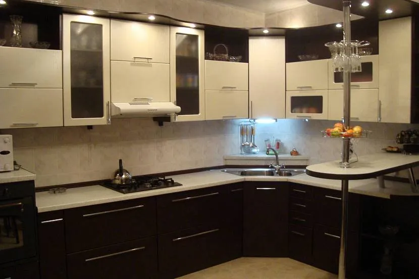Компактность гарнитура – основа комфорта в небольших помещениях. Поэтому угловая кухня должна иметь одну из сторон гарнитура, его угловую область, уже, чем 60 см. Этот вариант необходим при наличии помещения с выступами по стенам или при недостаточно широком проходе.