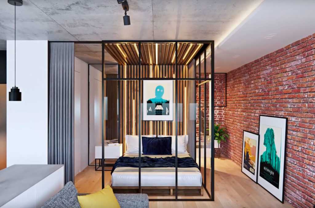 Казалось бы вроде бы формально мы его разделили, но при этом воспринимается как единое большое целое пространство. В центре помещения мы разместили спальню, потому что это основная зона которой будет пользоваться молодой человек. Это помещение мы оградили стеклянной перегородкой, а за изголовьем кровати идёт жёсткоская стена, и эта жёсткая стена отделяет прихожую квартиры от основной ее части.