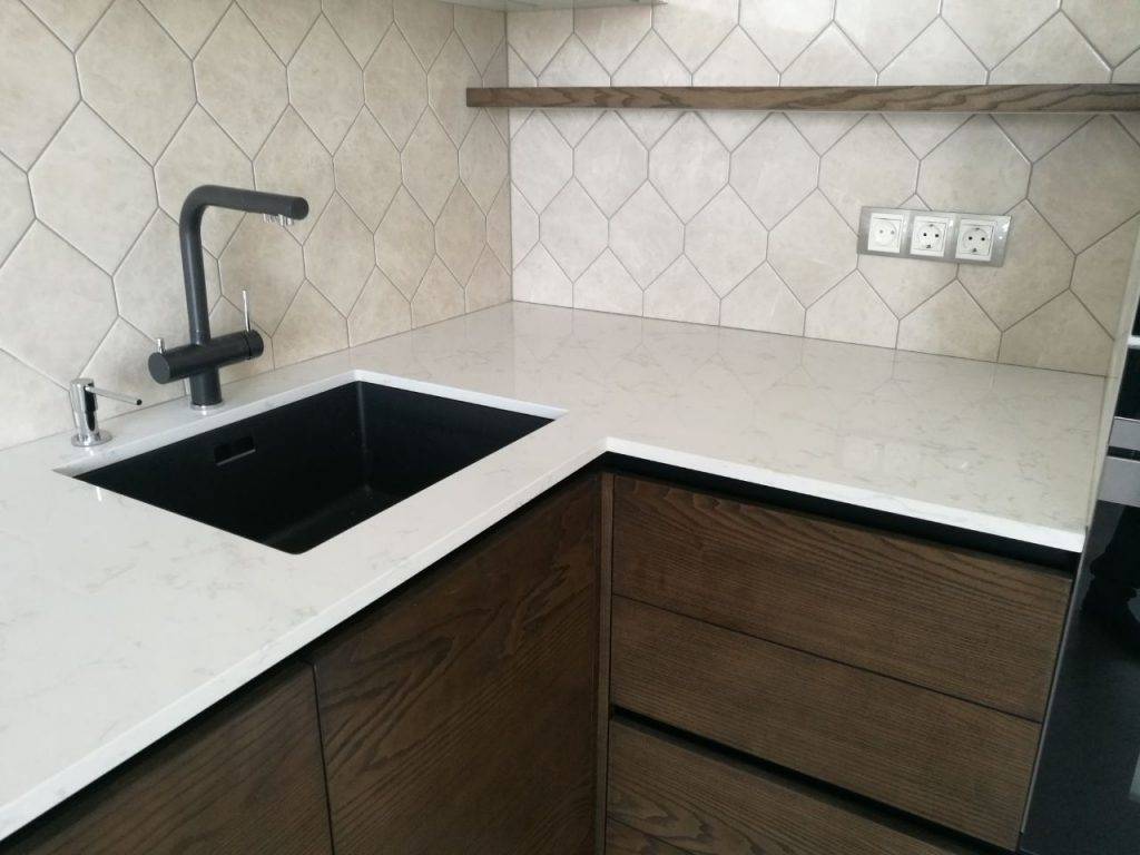 Такой результат можно достичь, во-первых, если подогнать высоту низа кухни под фартук, а щель обработать герметиком. Второй, но шокирующий вариант, – это сначала монтаж кухни, а потом установка фартука прямо на столешницу.
