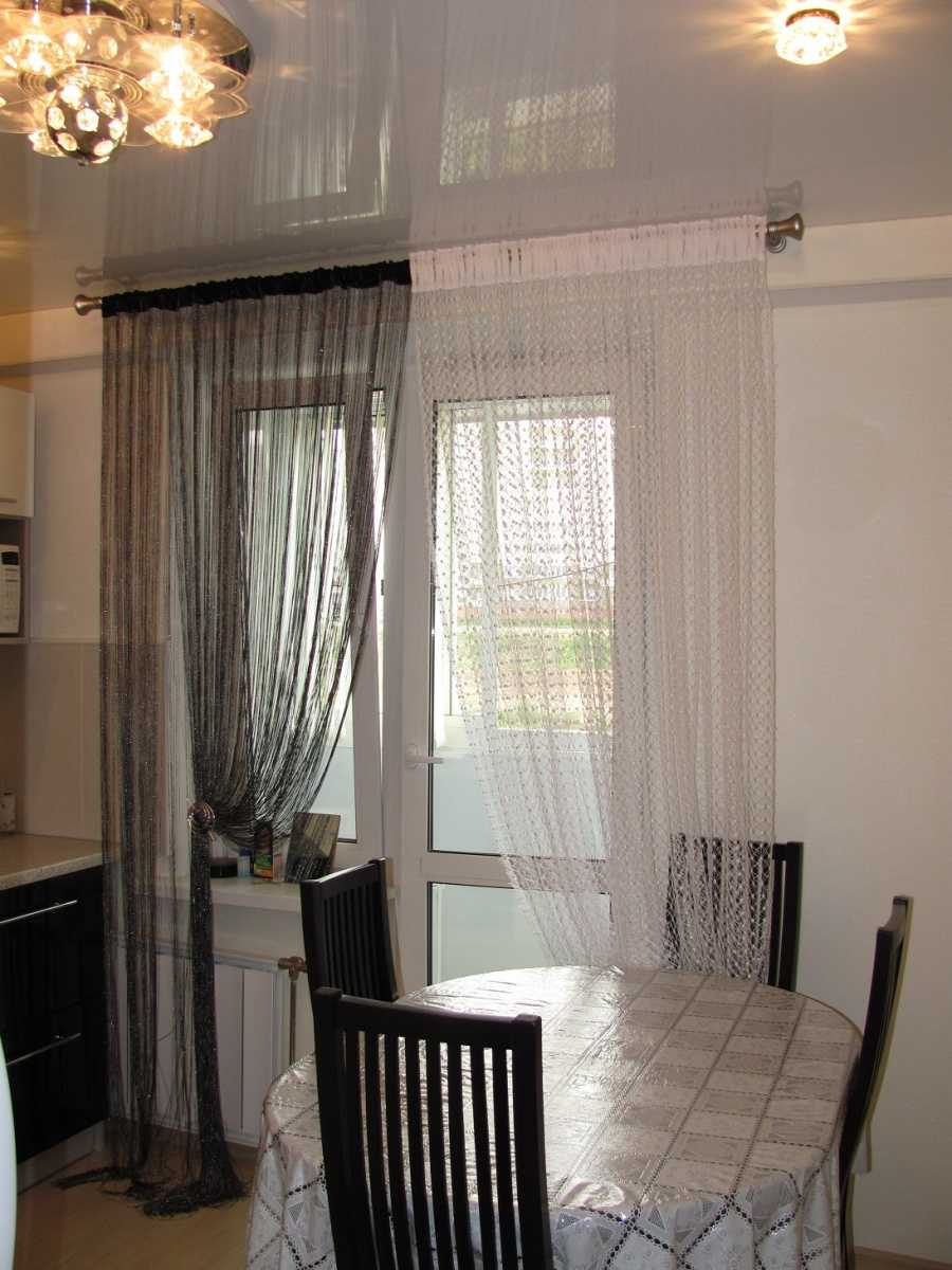 - Шторы нитяные – весьма удобный вариант оформления балконной двери, который не препятствует выходу.