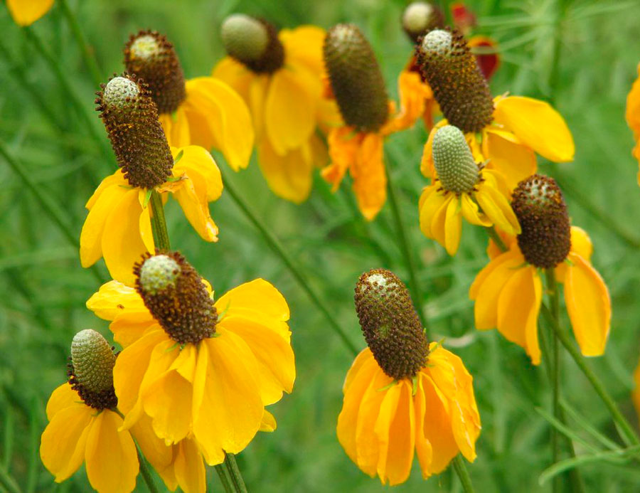 - Рудбекия – ярко-желтые, терракотовые и красноватые соцветия отличаются плотностью. Это растение нуждается в регулярном поливе и солнечных лучах. Цветет, начиная с первого летнего месяца до заморозков.