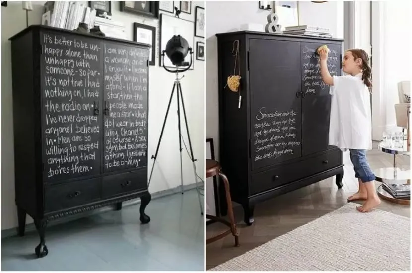 Мебель как доска для заметок. Краска с эффектом грифельной доски – стильное решение для современных интерьеров в индустриальном или скандинавском стиле. Составом можно задекорировать фасад шкафа или столешницу, а затем делать заметки, составлять списки покупок или учить иностранный язык.