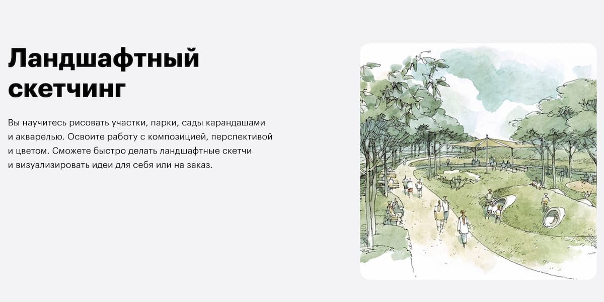 За два месяца вы научитесь рисовать растения, деревья, сады и парки акварелью и карандашами. Вы узнаете, как строить композицию участка и стилизовать объекты, сможете находить точные ракурсы, чтобы показать участок с разных сторон, а также научитесь быстро зарисовывать основные постройки и озеленение