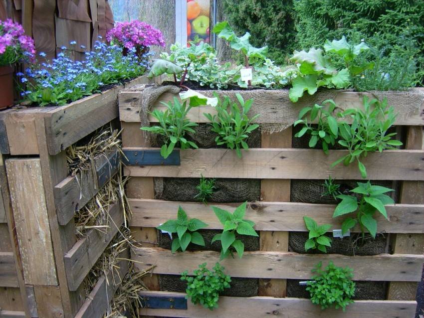 - вертикальное размещение. Грядки также выполняют в контейнерах, но располагают их вертикально друг над другом в виде ступеней. Таким образом можно сэкономить пространство и создать интересный дизайн;