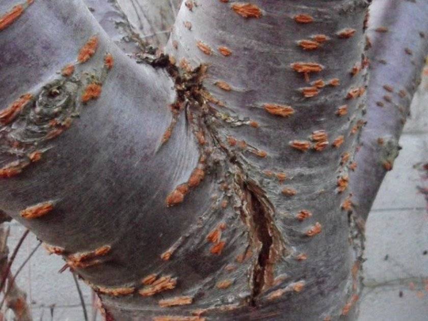 Кора может повреждаться также лучами солнца или крепкими морозами. Морозобоины и солнечные ожоги достаточно сложно заметить. Трескаться и отслаиваться кора может начать только через 2–3 года после травмы.