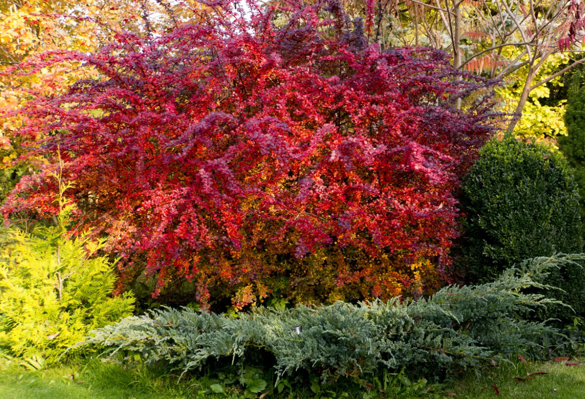 - Барбарис Тунберга, шикарный кустарник, весь укрытый изумрудно-зелёными, красноватыми с жёлтой каймой листочками. Выше 3 метров куст не вырастает. Для посадок нужны солнечные участки, без сквозняков. Практически не нуждается в поливе.
