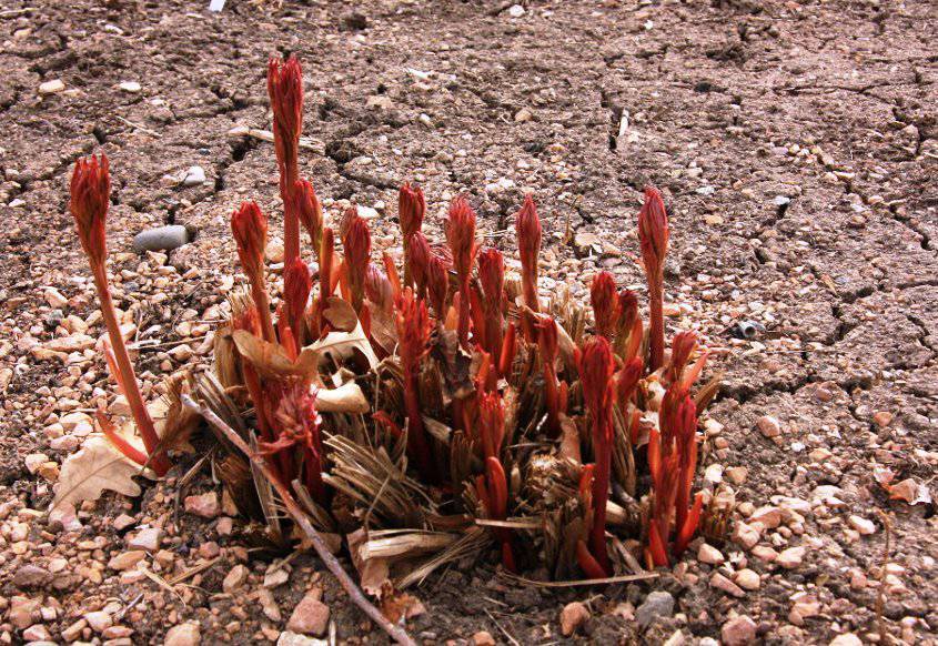 - Первую подкормку вносят, как только из почвы покажутся красные ростки. 1 ст.л. аммиачной селитры растворяют в 10 л воды и поливают растения из расчета – ведро под каждый куст. После этого почву мульчируют перегноем, который будет постепенно отдавать растению питательные вещества.
