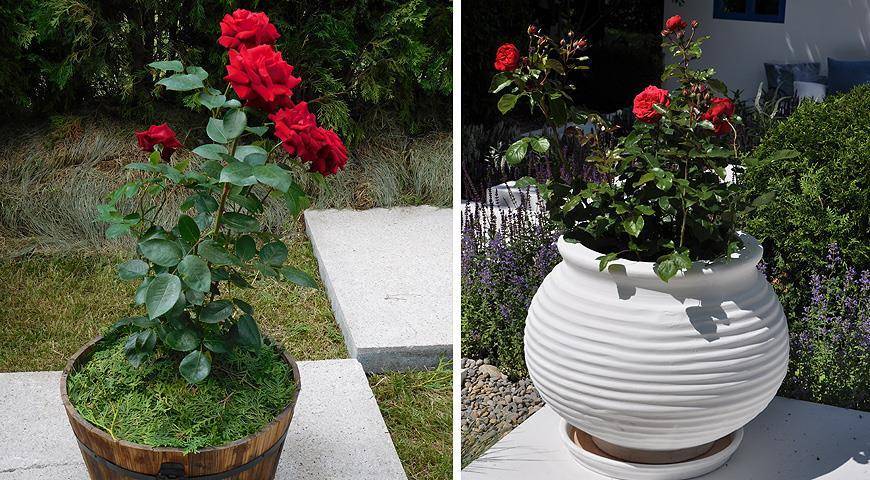 В контейнерах можно выращивать практически любые розы: даже сорта, которые требуют более теплого климата! Чаще всего в вазоны высаживают миниатюрные сорта, но можно использовать и компактные розы флорибунда, патио и штамбовые: современные садовые сорта, устойчивые к заболеваниям.