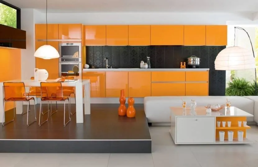 Кухня-гостиная в оранжевых тонахИсточник kitchensinteriors.ru