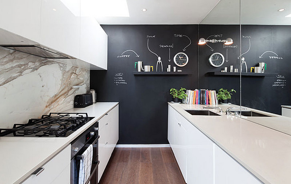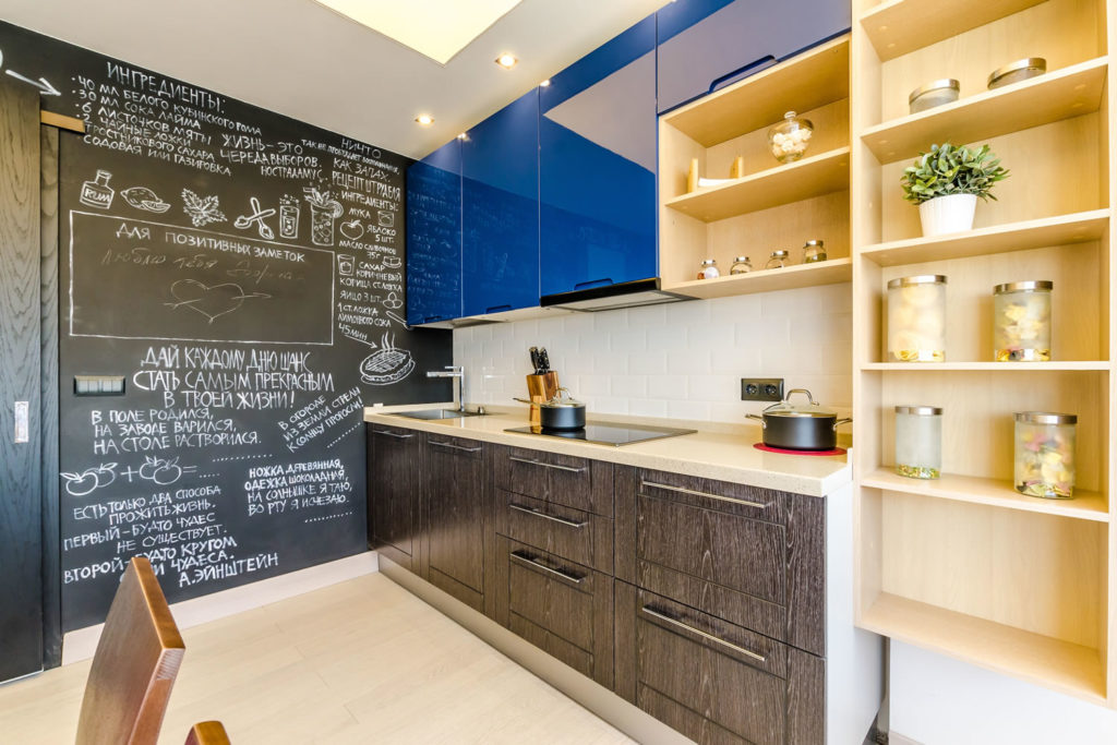 Грифельное покрытие может занимать стену целиком или только ее часть, для маленькой кухни подойдет небольшая меловая доска или нанесение специальной краски на дверцу холодильника или кухонных шкафчиков.