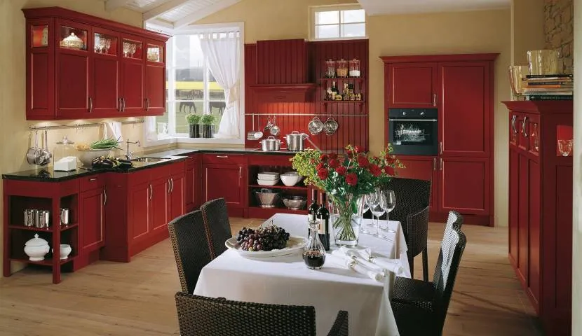 Кантри – дощатый пол; плитка, имитирующая камень; изысканная деревянная мебель. Технику в данном случае лучше спрятать за фасадами, то есть выбрать встраиваемые модели.