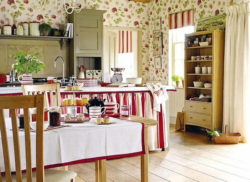 Кухня в стиле кантри – тумба со шторками, римские шторы на окнах, занавеска Источник pocketmags.com