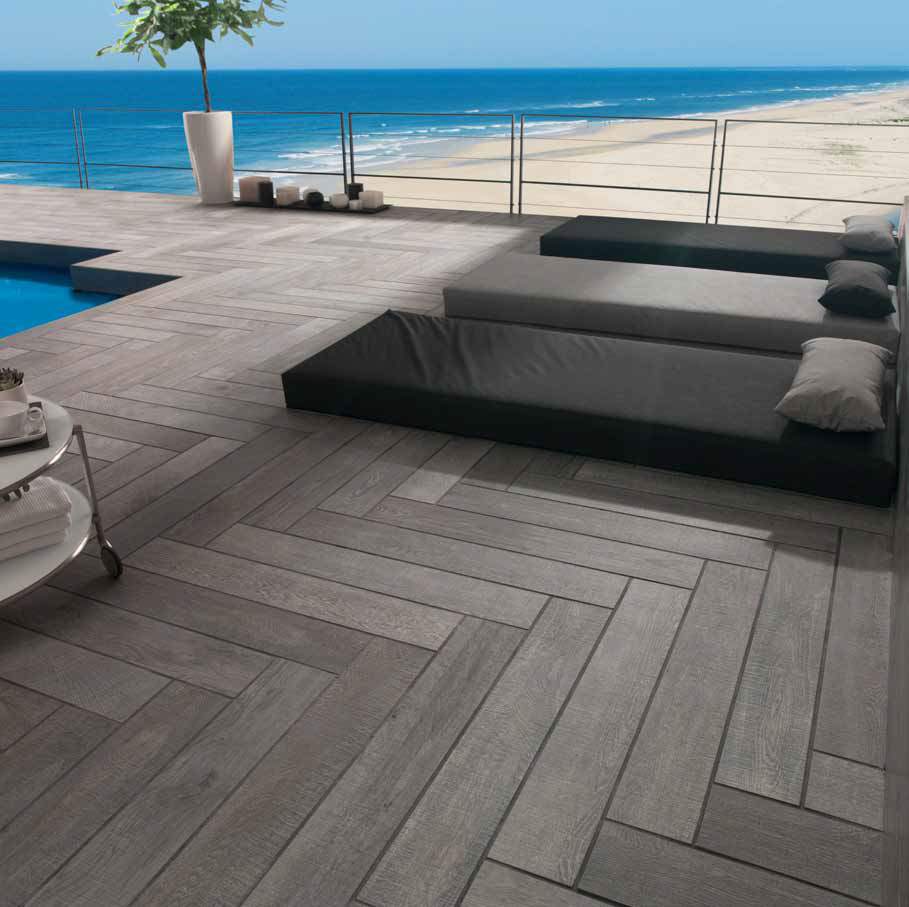 Чуть моложе, чем широкоформатные, керамогранитные плитки толщиной 2 см – для укладки снаружи без использования клея. Среди них вы также можете найти такие, которые имитируют доски – для тех, кто хочет иметь террасу, которая выглядит как деревянная, но в то же время – безопасна в использовании и не требует каких-либо специальных процедур.