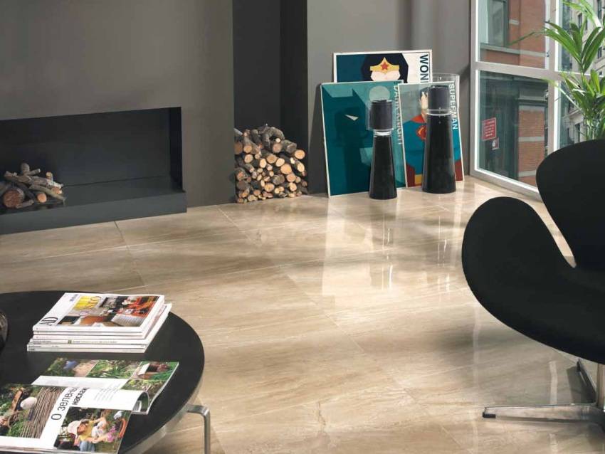Еще одна комната, где будут всегда уместны элементы дерева — это гостиная, в особенности если в ней стоят книжные шкафы. Для гостиных выбирают как светлые, так и темные тона напольной плитки «под дерево» — в зависимости от остального интерьера. Светлый березовый или ясеневый пол поможет сделать комнату еще просторнее, а черное дерево или благородные темно-коричневые оттенки станут акцентом для изысканной мебели и аксессуаров.