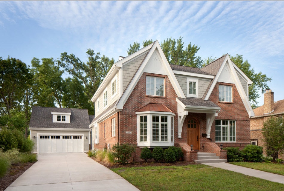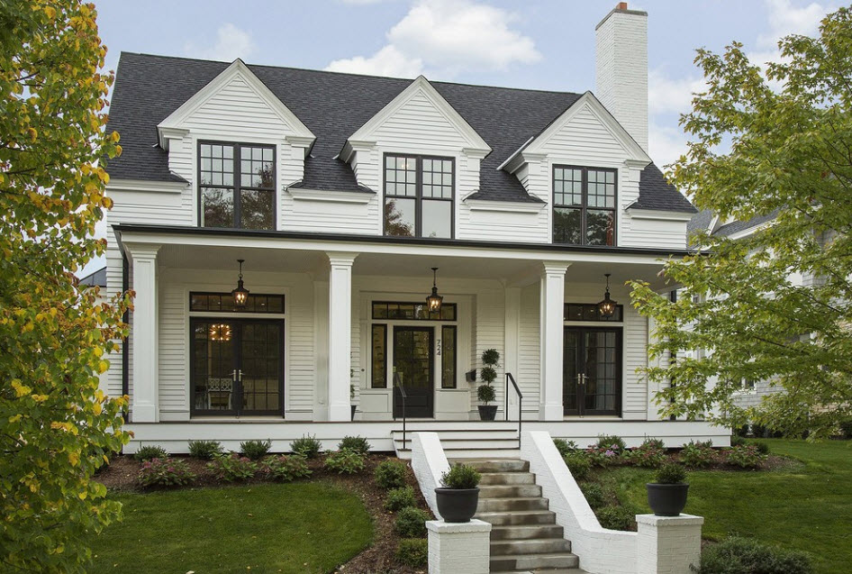 Декорирование такое же, как у общего фасада дома. Интересное сочетание дают соединение различных материалов строительства или отделки: дерево и натуральный камень, кирпичная кладка и декоративная штукатурка, сайдинг разного цвета + фундаментные панели.