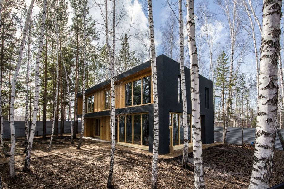 На террасе с широкими ступенями можно устроиться с комфортом, положив подушки прямо на обработанные доски. Коттедж представляет собой лаконичную одноэтажную постройку, напоминающую бытовку или дом из контейнеров. Тёмный графитовый цвет делает его современным и придаёт облику благородства.
