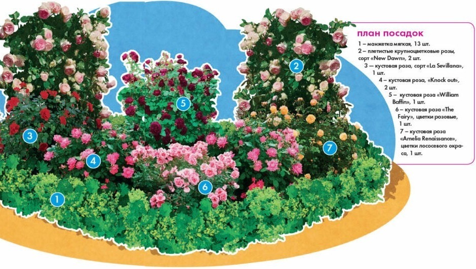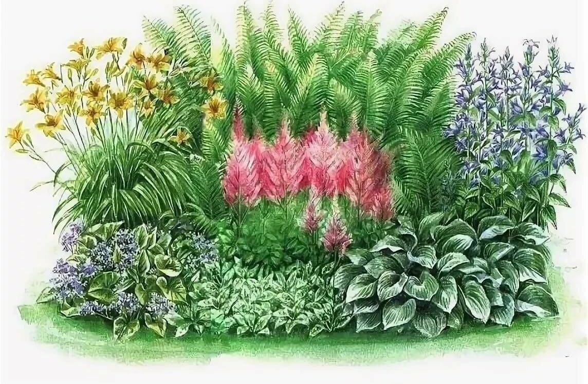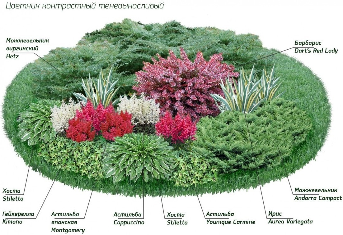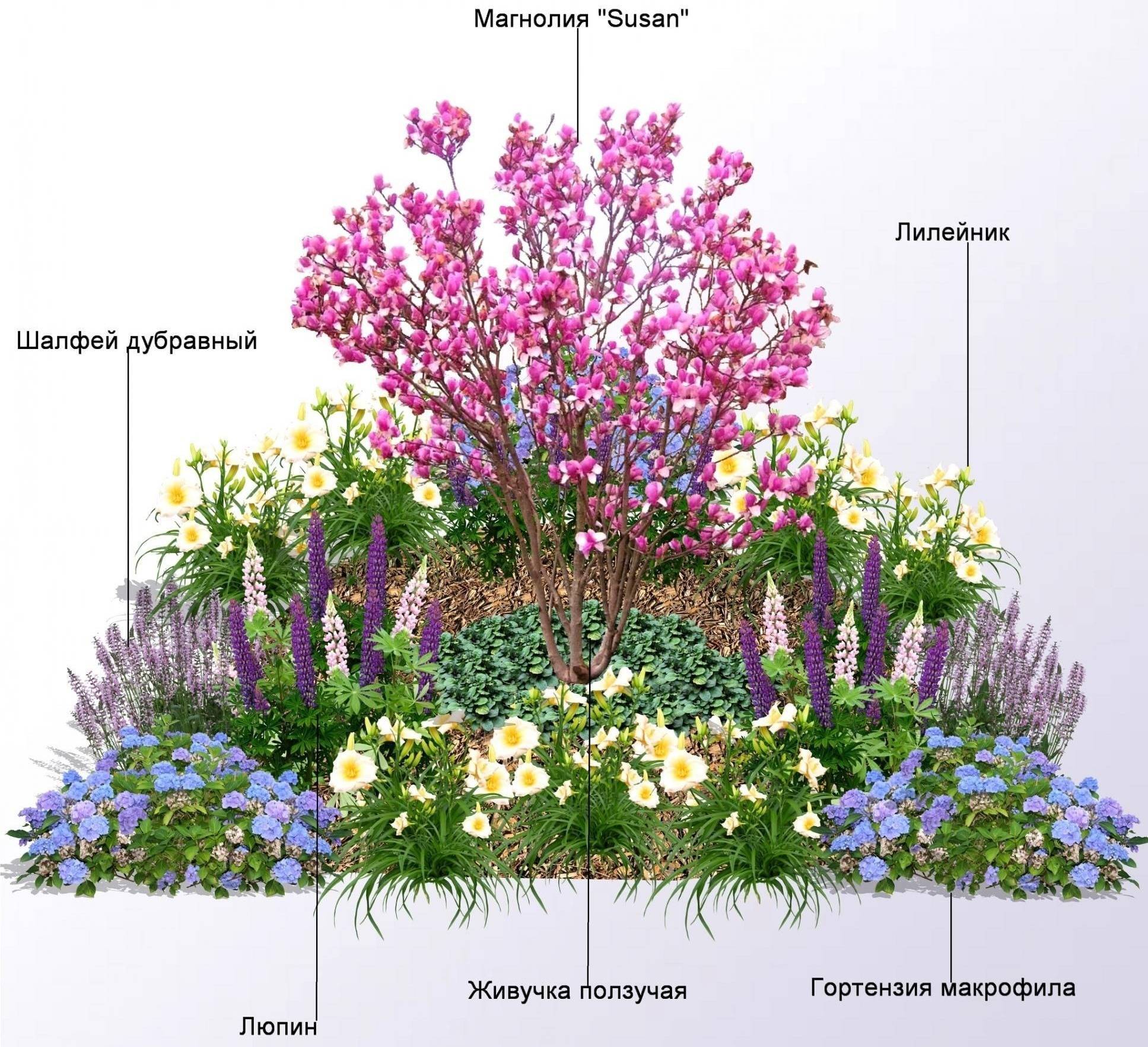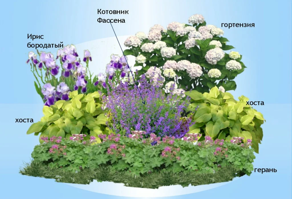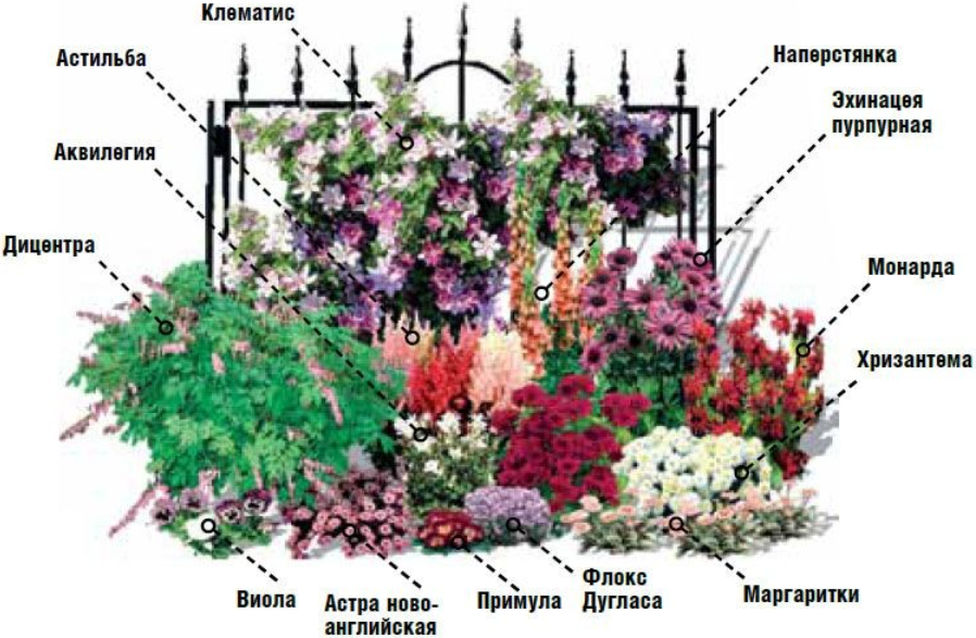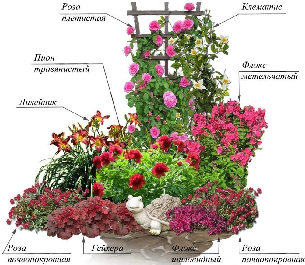 Цветники из многолетников и кустарников для непрерывного цветения с фото, описанием, названиями цветов и разбивочными чертежам