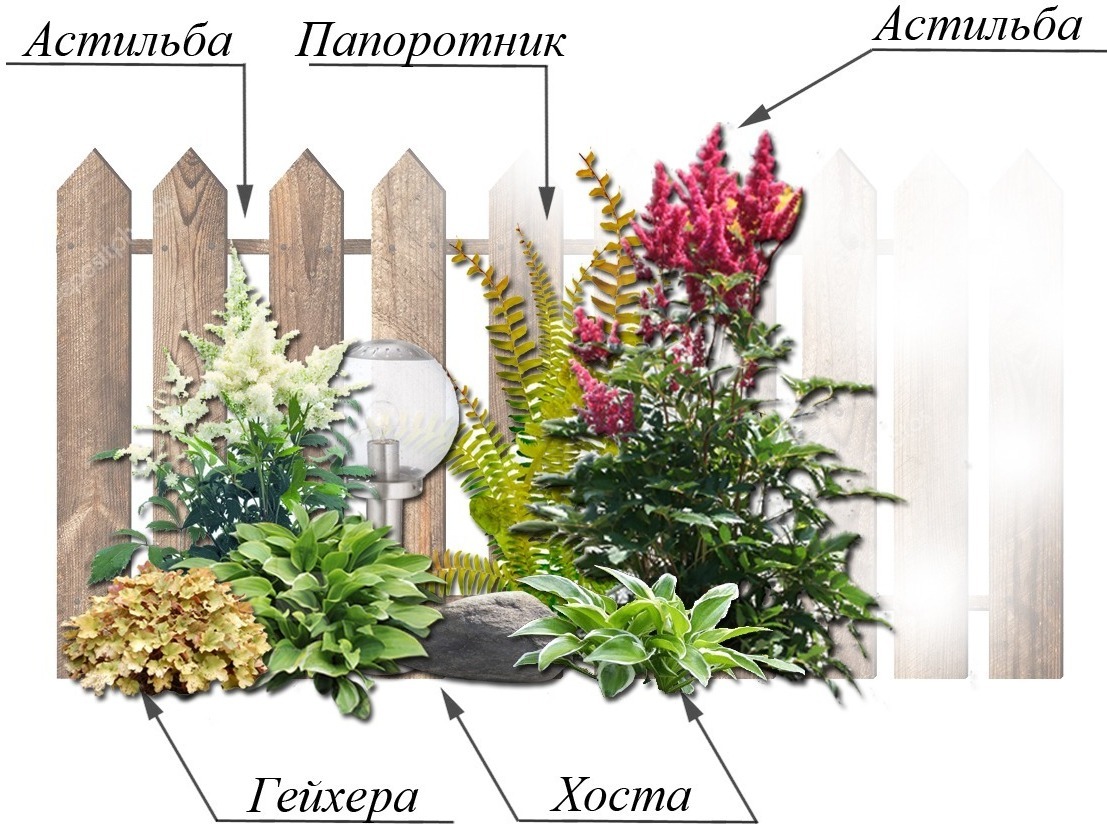 Как у любого цветника, имеющего односторонний обзор (когда он просматривается только с одной стороны), на задний план высаживают растения высокие (травы, кустарники, даже небольшие деревца), в центре – растения среднерослые, на передний план – самые миниатюрные.