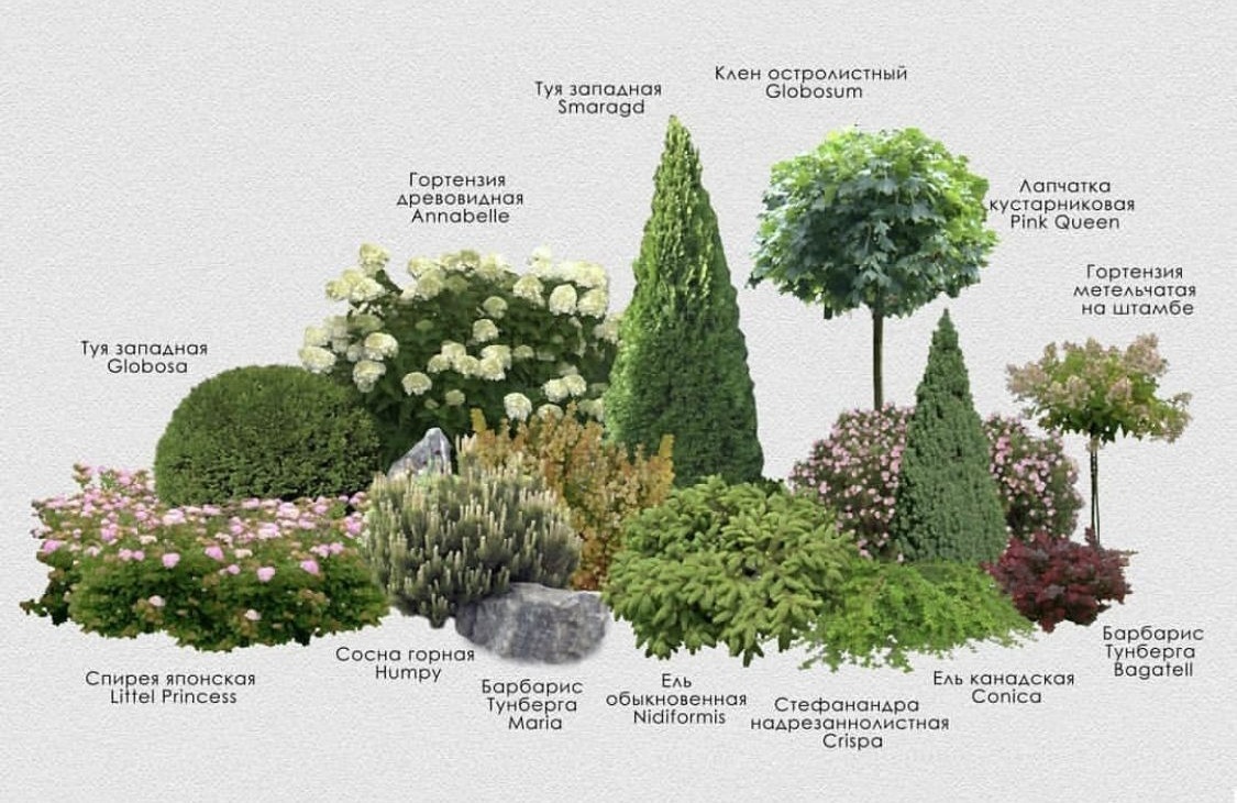 Эффектным украшением придомовой территории станут не только низкорослые многолетники, но и кустарники, которые хорошо сочетаются практически с любыми культурами. Акцент можно сделать на определенные растения, имеющие свои особенности.