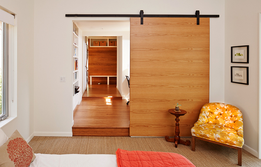Раздвижные межкомнатные двери устанавливаются на направляющие рельсы и открываются подобно дверям в шкафе-купе. Особенно эффектно выглядят системы, которые открываются внутрь перегородки. Если вы хотите сделать именно так, то продумайте все еще на начальном этапе ремонта помещения. В противном случае дверь нужно будет монтировать на внешние направляющие.