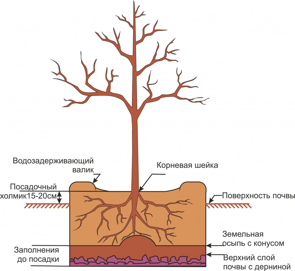 Все это время саженец необходимо поддерживать в вертикальном положении, слегка поддергивая и подтягивая его кверху. Чтобы при усадке корневая шейка саженца не оказалась ниже уровня поверхности почвы, яму засыпают 15–20 см выше этого уровня.