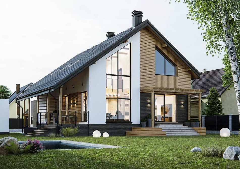 Крыльцо должно находиться в стилистическом единстве с подводящей к нему дорожкой и являть собой дизайнерскую кульминацию всех описанных ранее элементов. Обычно к двери ведет несколько ступеней, так как в российских условиях дом бывает чуть приподнят над уровнем земли.