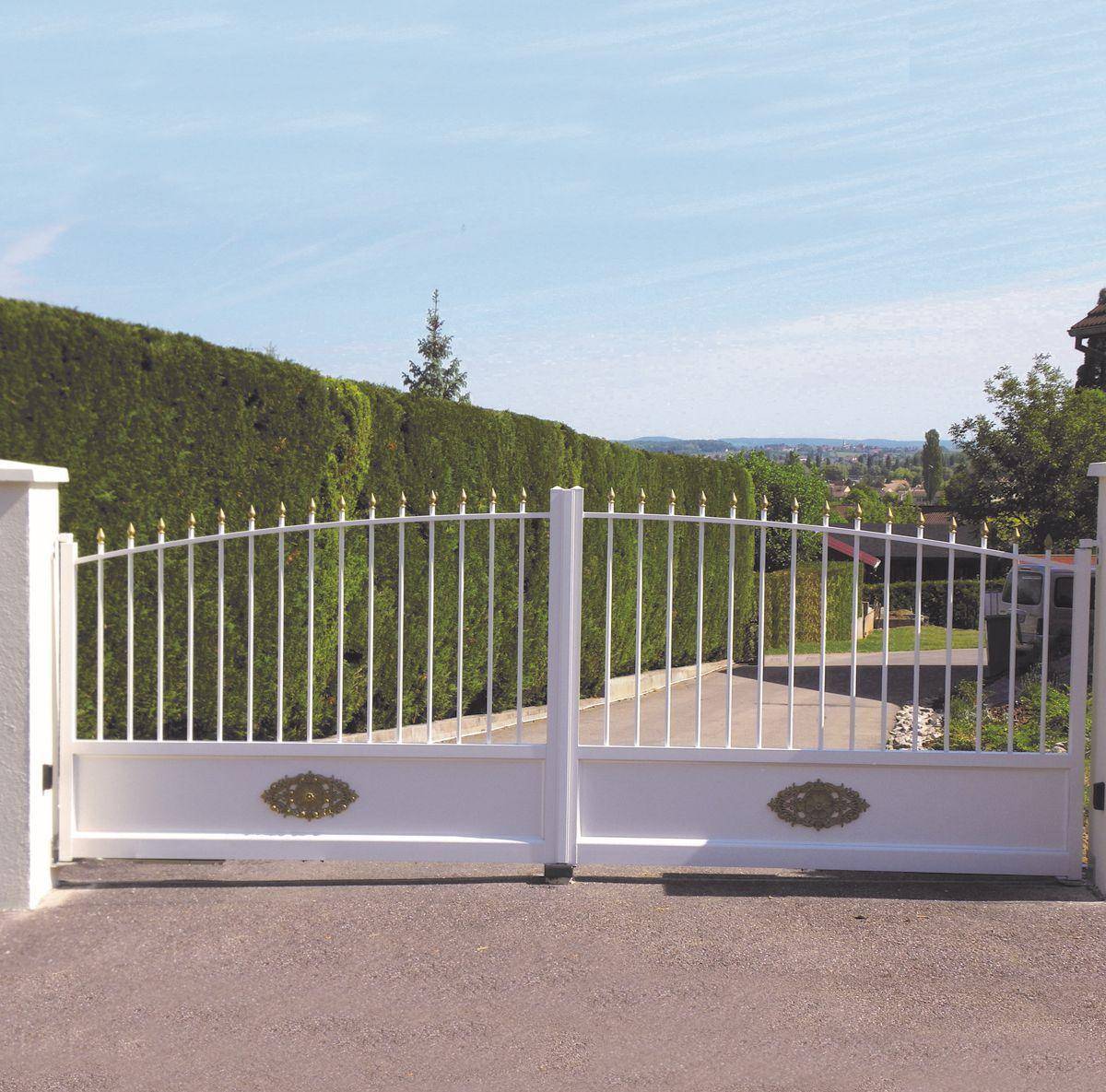 Ворота из пластика очень легкие. Обычно этот материал закрепляют на металлической раме и оформляют накладными коваными украшениями.