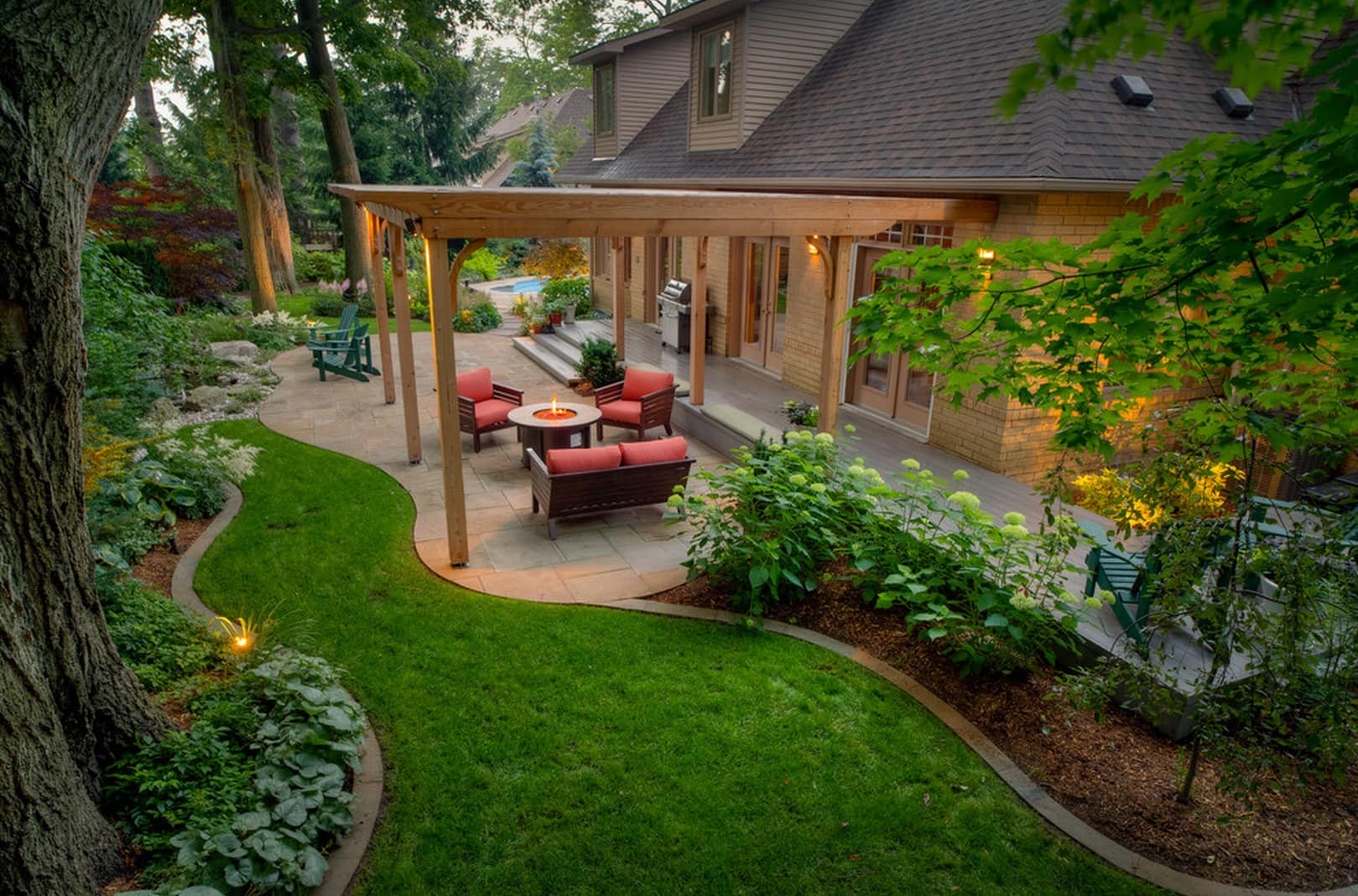 Для того чтобы всем отдыхающим было комфортно, в зоне патио стоит предусмотреть одновременно и затененную и солнечную область. Для создания тени можно установить декоративные навесы или перголы, которые будут оплетать вьющиеся растения, например: