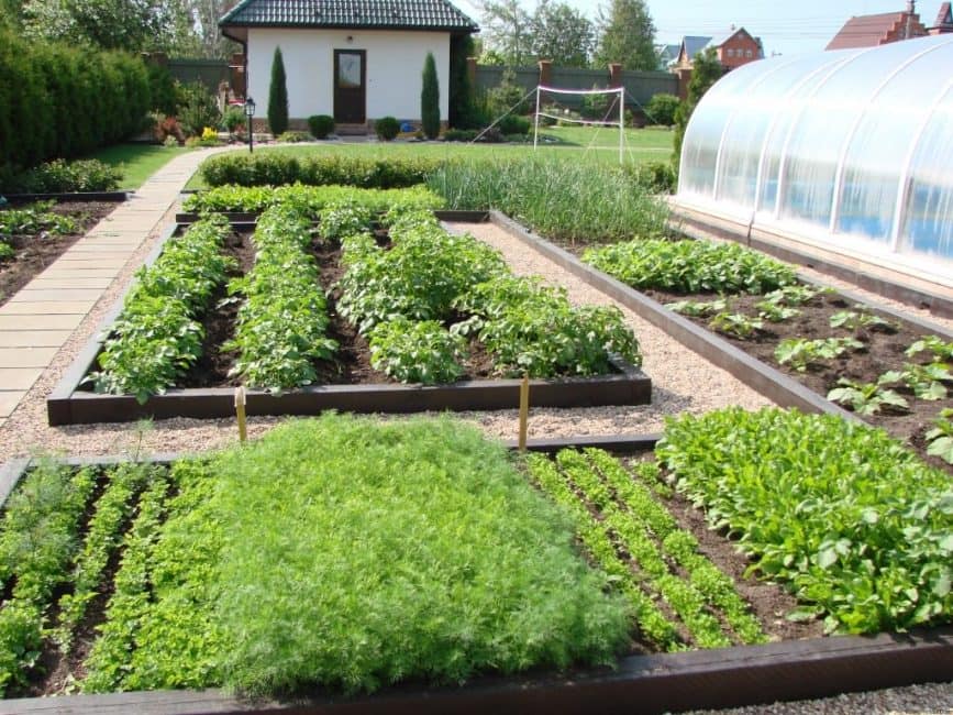 Красиво-оформленные овощные и ягодные грядки уже давно стали частью декоративного ландшафта. Они гармонично соседствуют с цветочными клумбами и даже украшают отдельные зоны сада. Чтобы придать огороду ухоженный вид, между грядками можно уложить газон в рулонах, засыпать гравием.
