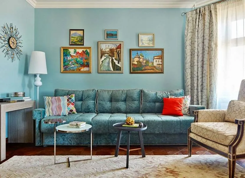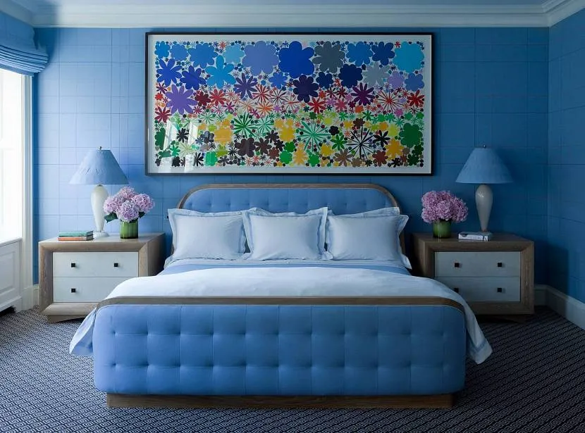 Ярко-синими могут быть фоторамки небольшого размера, детали на шторах или принт на мебели. Голубой можно внедрить в виде цветочного принта на неярких поверхностях (той же скатерти).
